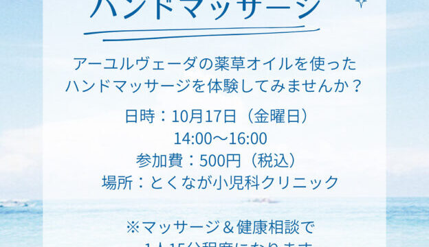 お知らせ ハンドマッサージ体験してみませんか? 2025年10月7日 tokushoukai 体とこころのサロン「空-sora-」 アーユルヴェーダは 「生命の科学」 あるいは 「生命の智慧」 と言われます。 ですが、 あまりにも大きすぎて 初めての人には なんのこと? という感じかも …